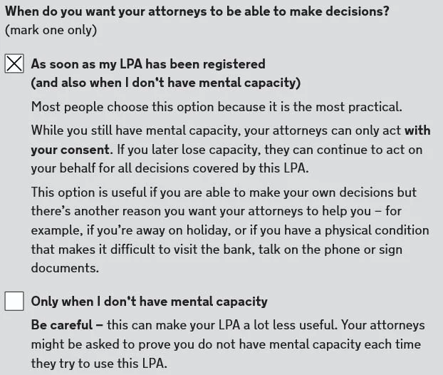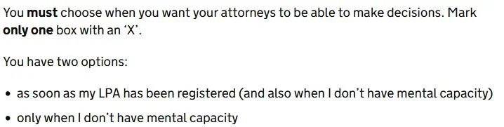 The decision on when attorneys can make decisions is made at the time of drafting the LPA, and you can access information about this in the form LP12 Make and register your lasting power of attorney. This is information you will see on the LP12: