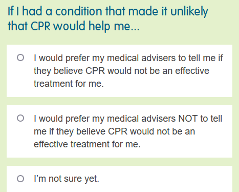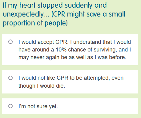 All to often it is this nuance of discussion that is lost, and a CPR discussion becomes a clunky question. It’s really helpful to see the three different scenarios set out clearly because understanding CPR in the context of overall health is so important. The Hospice UK Planning Ahead Tool is one way of approaching this important part of Advance Care Planning.