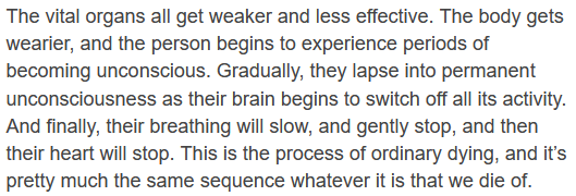 The third section describes when CPR will not help for someone who is already clearly dying. There is a description of what happens in Ordinary Dying and why CPR cannot be re started.