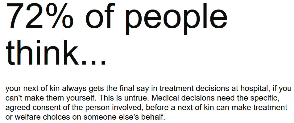 It’s a common misconception that your next of kin can make treatment decisions for you if you are in hospital but this is not true. Medical decisions require consent of the person involved before a next of kin can make treatment decisions on behalf of another person.
