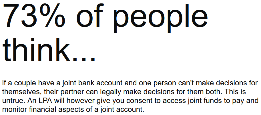 Another common misconception is having a joint bank account means you don’t need a Lasting Power of Attorney, again this isn’t true. A Lasting Power of Attorney will provide consent for you to access joint funds to pay and monitor financial aspects of a joint account.